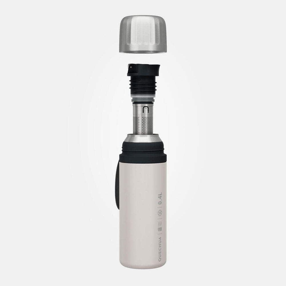 Muy aislante gracias a su doble pared de acero inoxidable, cuenta con tapón de apertura rápida que se abre con una mano, filtro de té extraíble, vaso doble pared y asa de transporte/0.4 L