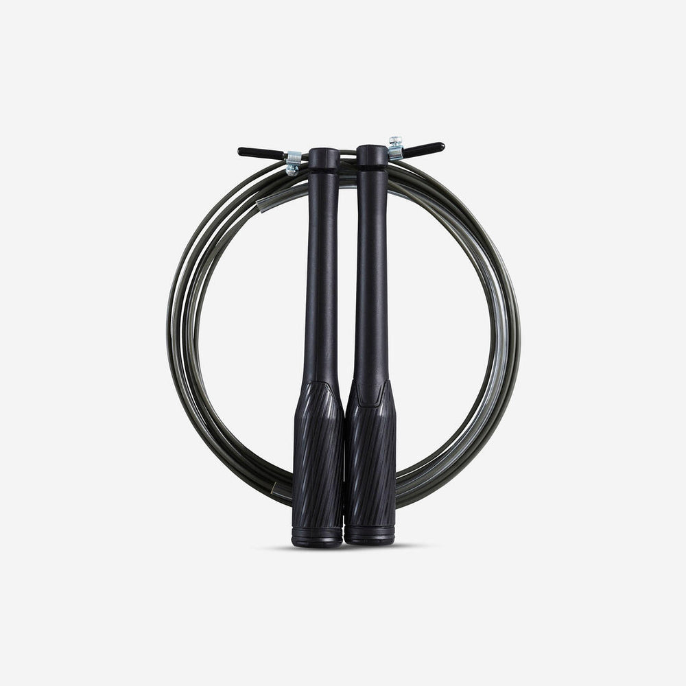 Esta cuerda para saltar tiene un cabezal giratorio de calidad para enlazar rápidamente saltos simples y dobles durante tus sesiones de cross training.