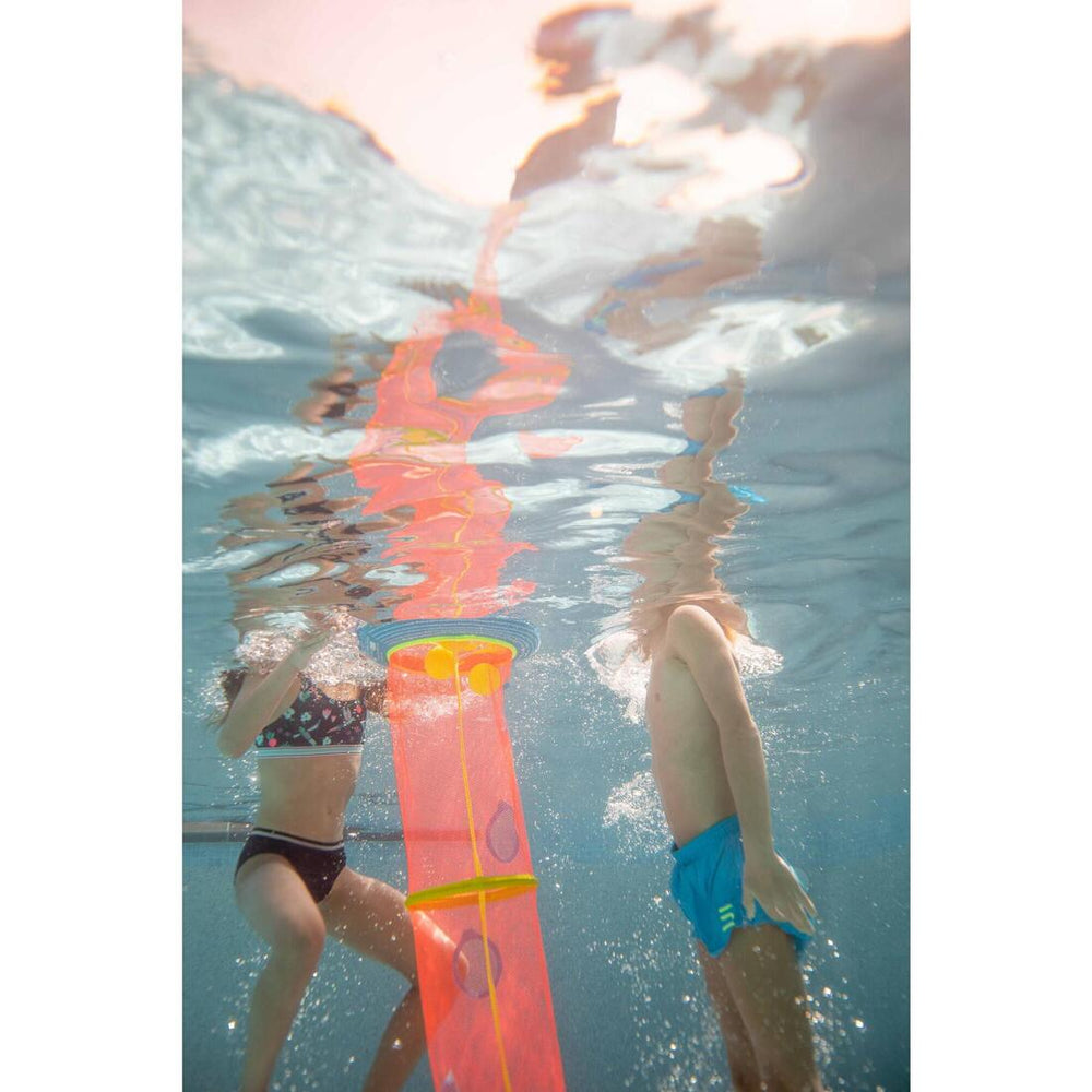 6 dianas que alcanzar con 3 pelotas para desafiarte y progresar mientras te diviertes aprendiendo inmersión. Este juego subacuático se transporta fácilmente gracias a su funda de transporte.