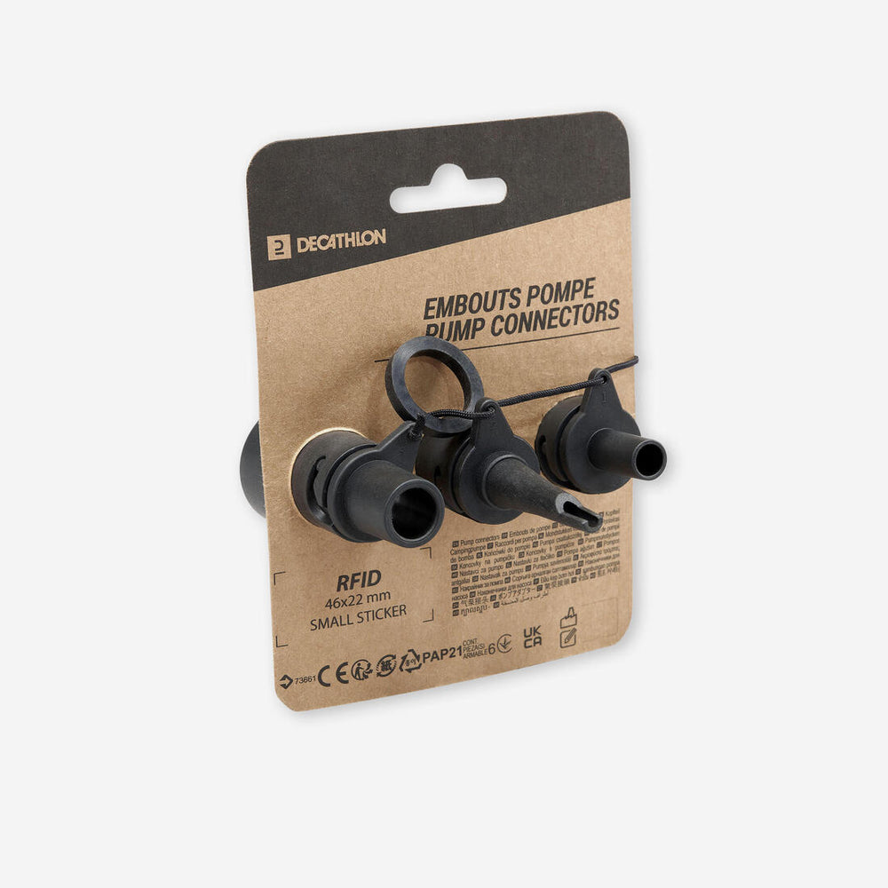 Este paquete contiene: - Una boquilla "boston" para inflar las casas de campaña, los colchones/aislantes y los kayaks de baja presión. - Una boquilla "mini boston" para inflar los asientos de kayak. - Un adaptador y boquilla para bombas eléctricas Quechua - Un adaptador para manguera boquilla "bayoneta" - Una boquilla fina para válvulas flexibles tipo "pato". - Un adaptador y una boquilla para inflar equipo de kitesurf.