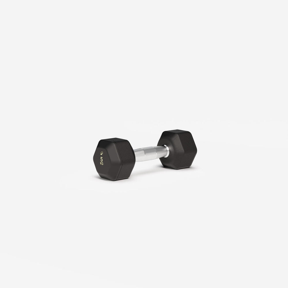 ¡No más mancuernas rodando por la habitación! Gracias a su diseño hexagonal de 6 lados, la mancuerna permanece perfectamente estable en el suelo después de cada ejercicio. Su revestimiento de caucho de alta calidad desempeña una doble función esencial: protege eficazmente tu equipo y tu suelo contra impactos repetidos, y a la vez reduce considerablemente las molestias sonoras durante tus entrenamientos.