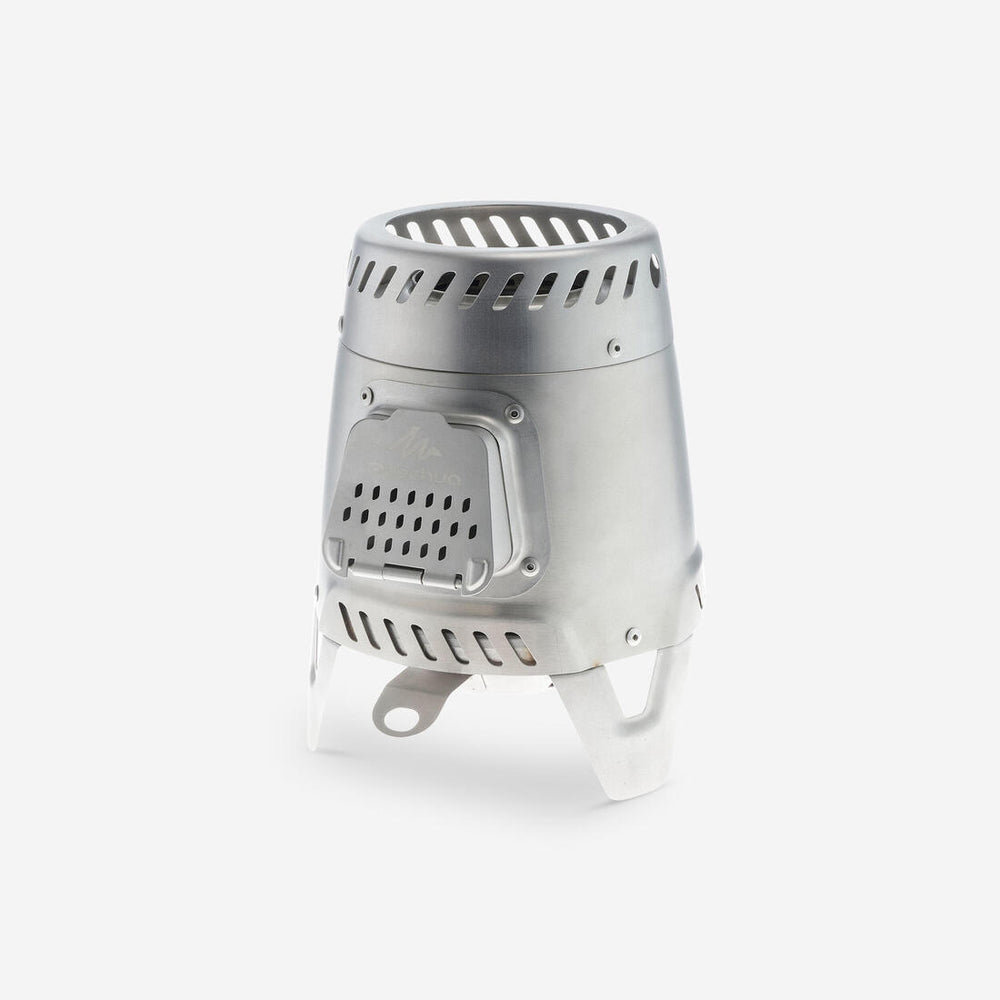 Este hornillo de madera, fácil de usar, es eficaz gracias a la doble combustión que limita la salida de humo y te permite calentar rápidamente los alimentos alrededor de una hoguera.
