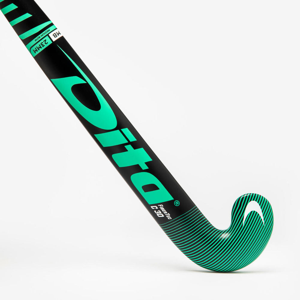 Según las normas de la FIH, el punto de curvatura máximo de un palo de hockey sobre césped debe estar ubicado como mínimo a 200mm del punto más alto de la pala del palo y la altura de curvatura máxima es de 25mm.