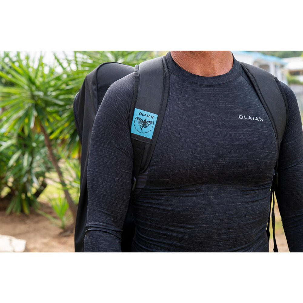 Playera anti-UV de manga larga, para protegerte del sol y limitar las irritaciones por contacto con la tabla. No se mueve, pues en la cintura cuenta con un innovador sistema de sujeción en las olas.