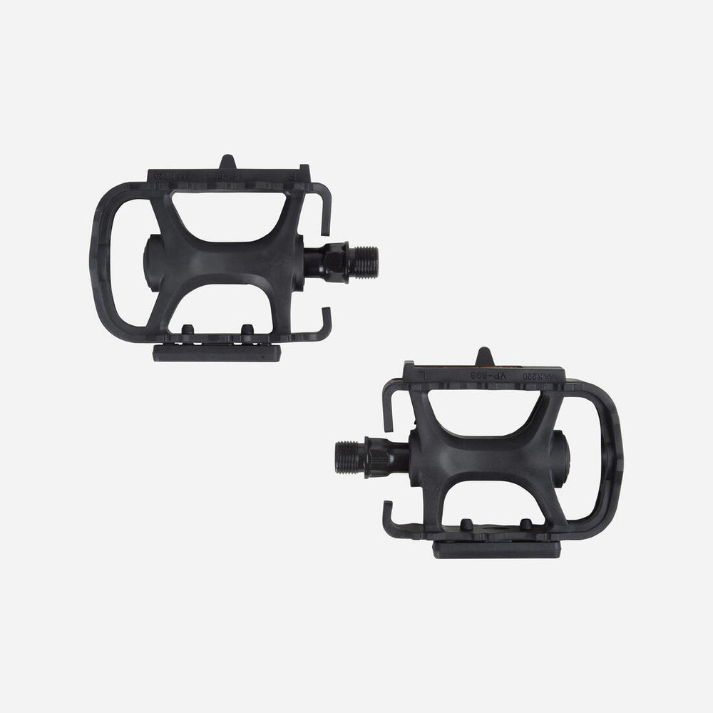 Fabricados en resina, los pedales BTT 100 limitan el riesgo de lesiones en las tibias y las pantorrillas en caso de retorno brusco del pedal.