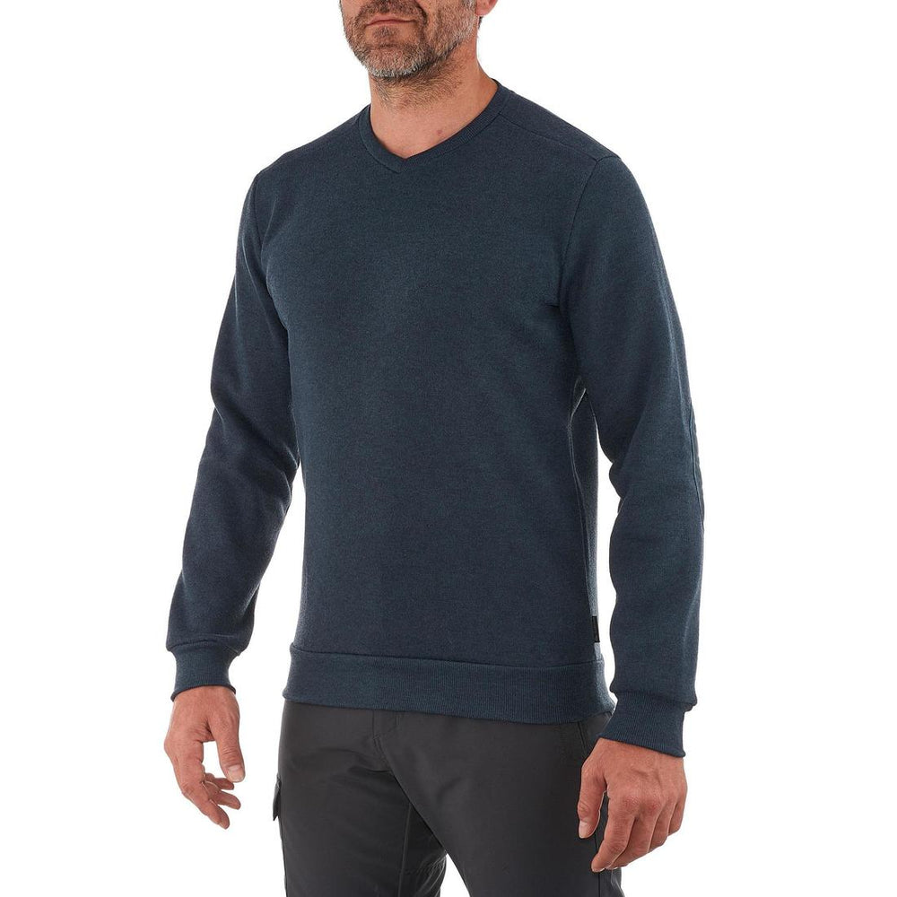 Suéter de senderismo NH150 con cuello V, cálido y transpirable, concebido para aportar calor y confort durante paseos por la naturaleza con clima fresco.